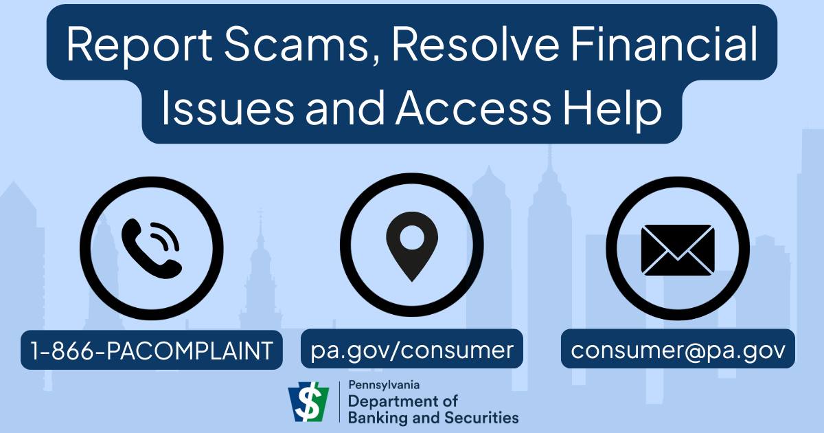 If you believe you have been the victim of a scam or need help resolving a financial issue, you can reach the Pennsylvania Department of Banking and Securities at 1-866-PACOMPLAINT, visit pa.gov/consumer or email consumer@pa.gov.