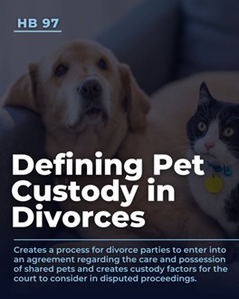 When I became a legislator, I pursued legislation to allow our courts to consider factors in awarding pets during divorces. Our courts would not tackle this issue, and even our appellate courts have addressed this matter. A recent decision specifically called for action by the Legislature, and mentioned the bill that I introduced, to give our courts guidance.