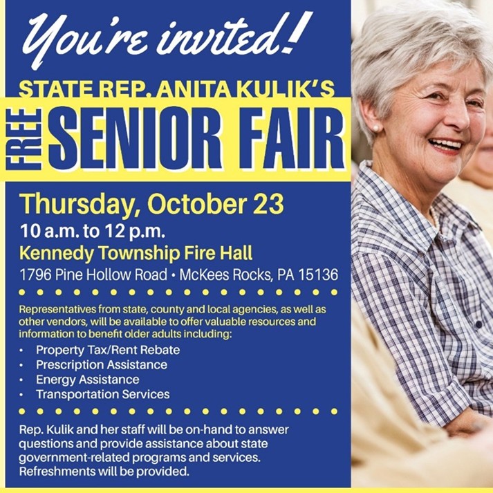 Mark your calendar for this year’s Senior Fair on Thursday, October 23 at the Kennedy Township Fire Hall. There will be resources and information for older residents. My staff and I will also be there to answer questions and help with state-related programs and services. I hope to see you there!