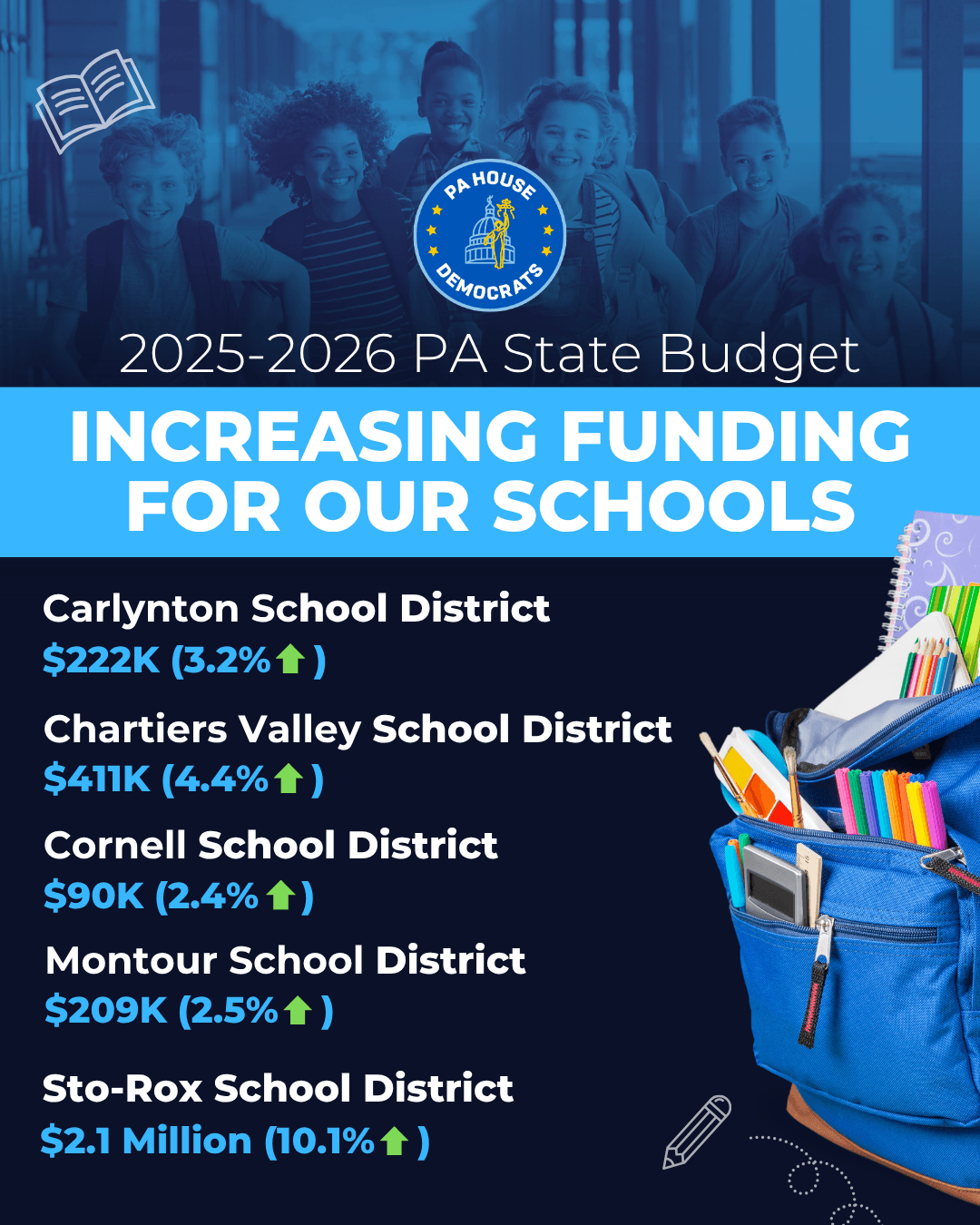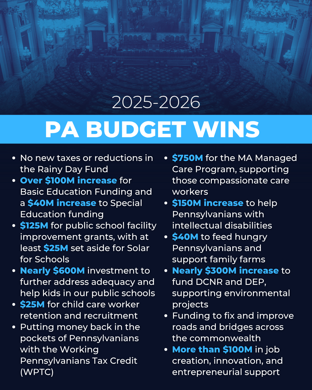 At long last, the state has a balanced, bipartisan budget. I voted for this plan because it’s a budget that helps every kid in Allegheny County’s schools, restores services, and prevents layoffs – with no tax increases or reductions in the Rainy Day Fund.