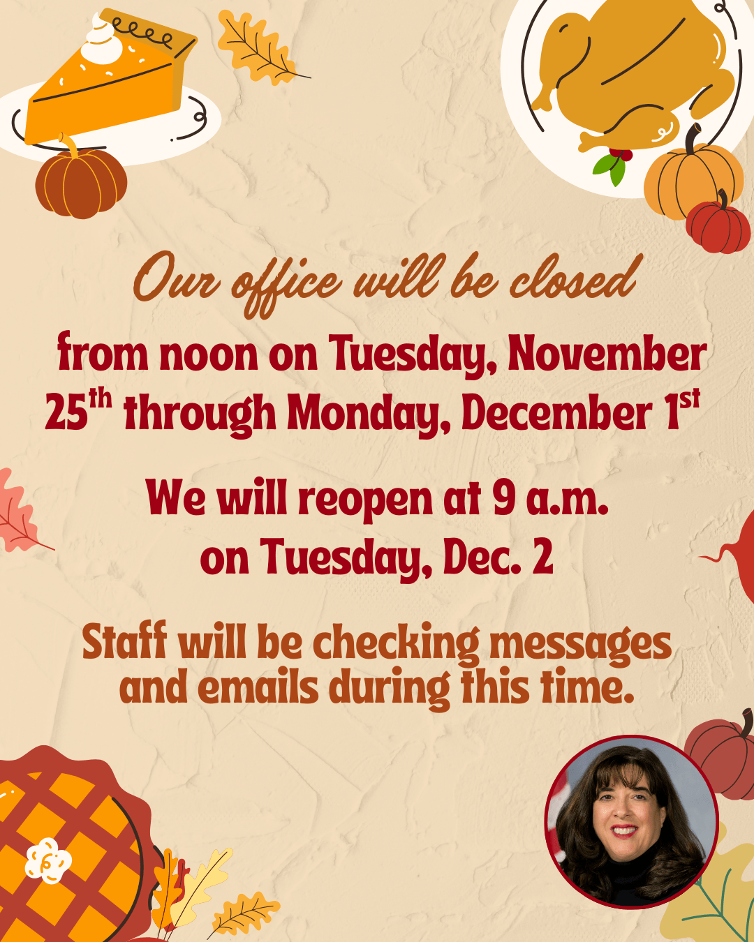 Please note that my district office will be closing at noon on Tuesday, November 25 and remain closed through Monday, December 1. My staff will be checking messages and emails during this time. The office will reopen for normal business hours on Tuesday, December 2.