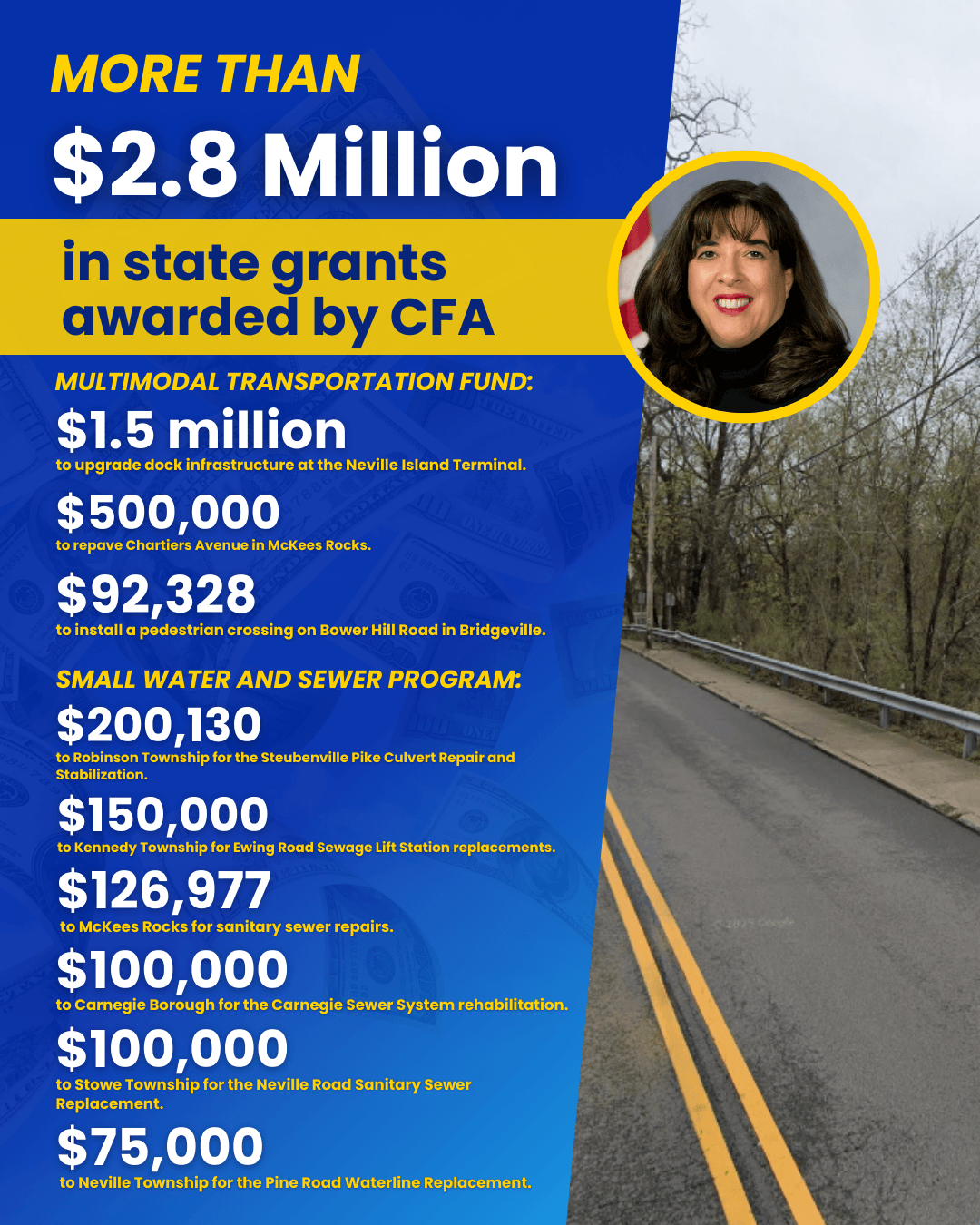 I’m pleased to announce that more than $2.8 million in state grants from the Multimodal Transportation Fund and the PA Small Water and Sewer Program will support projects across the 45th Legislative District.