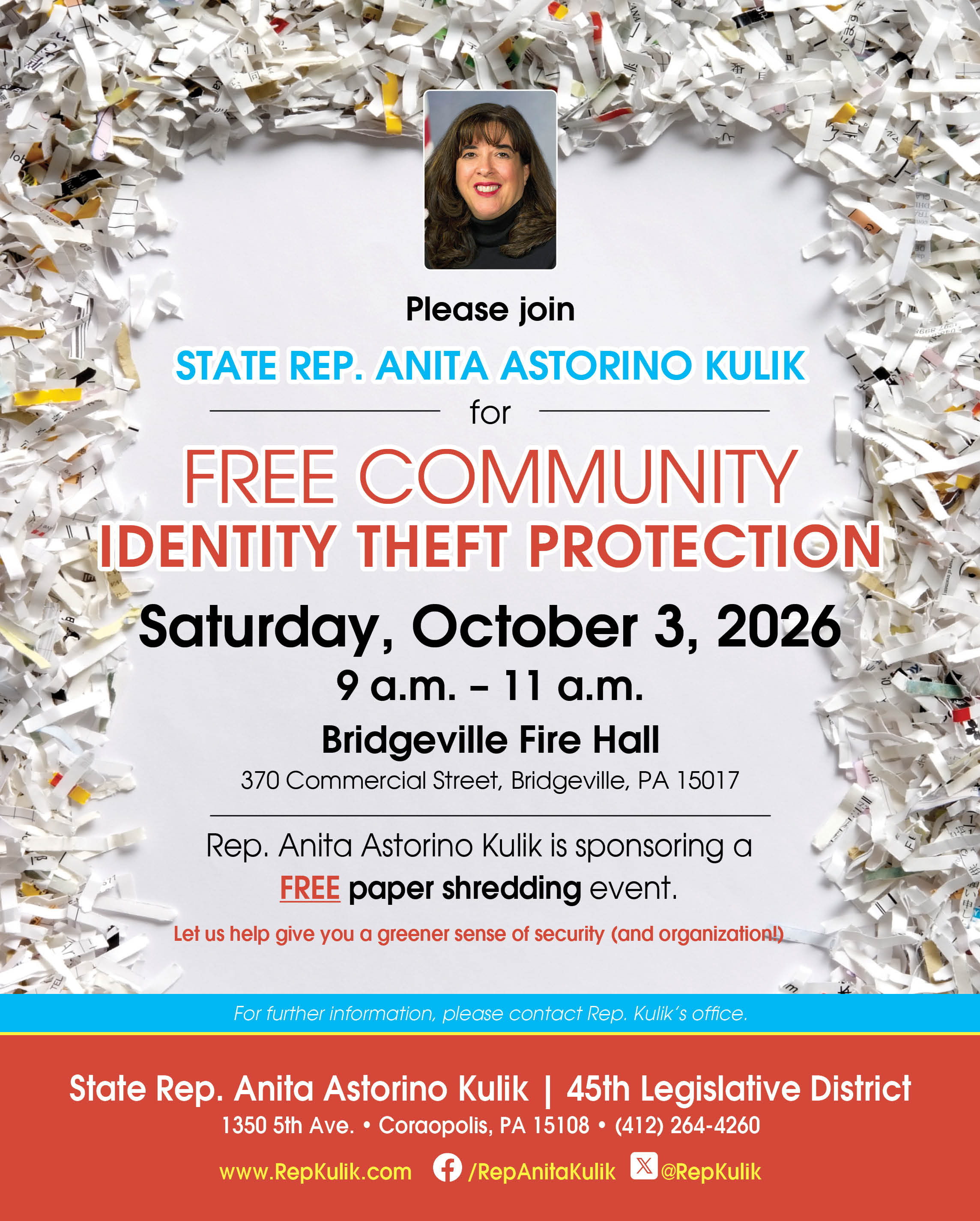 Thank you to everyone who came out to the Burkett Sports Complex for my free shredding event. I also want to thank my staff for their hard work and the Allegheny County Sheriff’s Office for collecting unwanted medications for Project D.U.M.P.