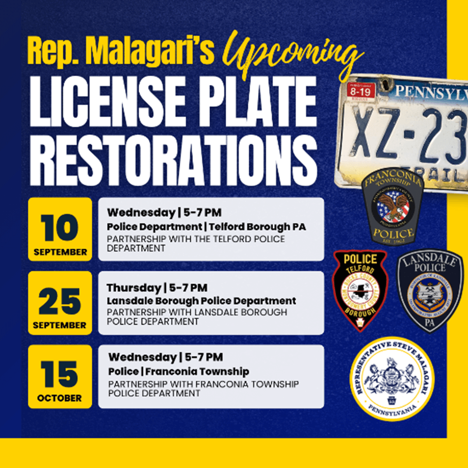 I'm hosting a series of FREE License Plate Restoration Events to help you get a new plate, featuring PA’s new Liberty Bell Design. My staff will be on hand to process the paperwork for you and make this process hassle-free.