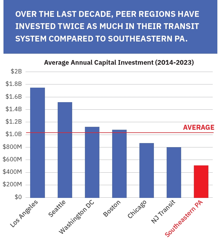 We already lag significantly behind our peer regions in terms of investing in our transit system, and this older infrastructure makes delays and unreliable service more likely. Because of this consistent underfunding, SEPTA now has a maintenance backlog of over $5.1 BILLION. This proposal would only grow this backlog while also depleting their capital funding – and doing nothing to fix their structural deficit in the long term.