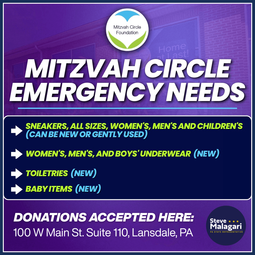 Mitzvah Circle, a 501(c)(3) nonprofit that provides clothing and other necessities to so many of our neighbors, suffered a devastating fire last week and lost two truckloads full of supplies. To help them make up for what was lost, I'm joining my colleagues in the PA House and Senate in serving as a drop off point for donations to help replenish the organization's most critical needs.
