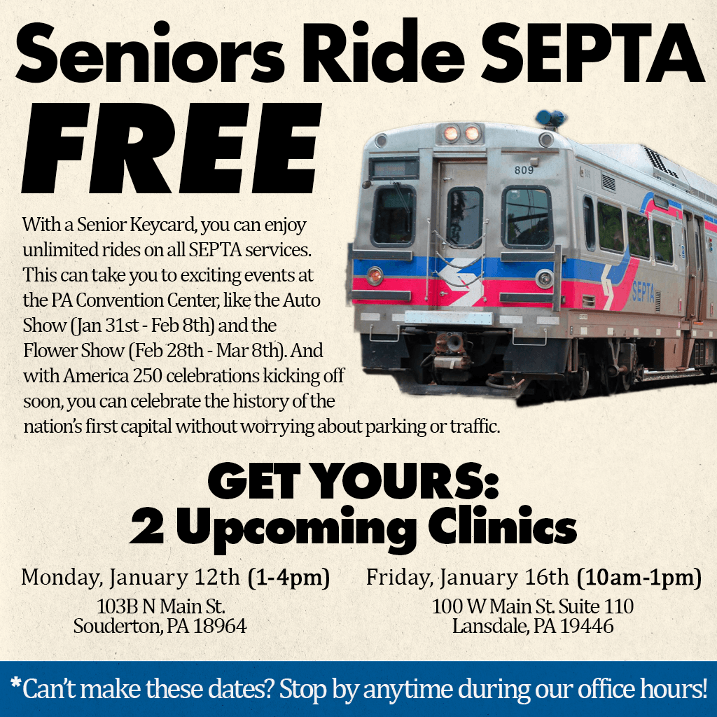 65+ and planning a trip to Philly? Skip the traffic and parking headaches and get your SEPTA Senior Card from my office!??