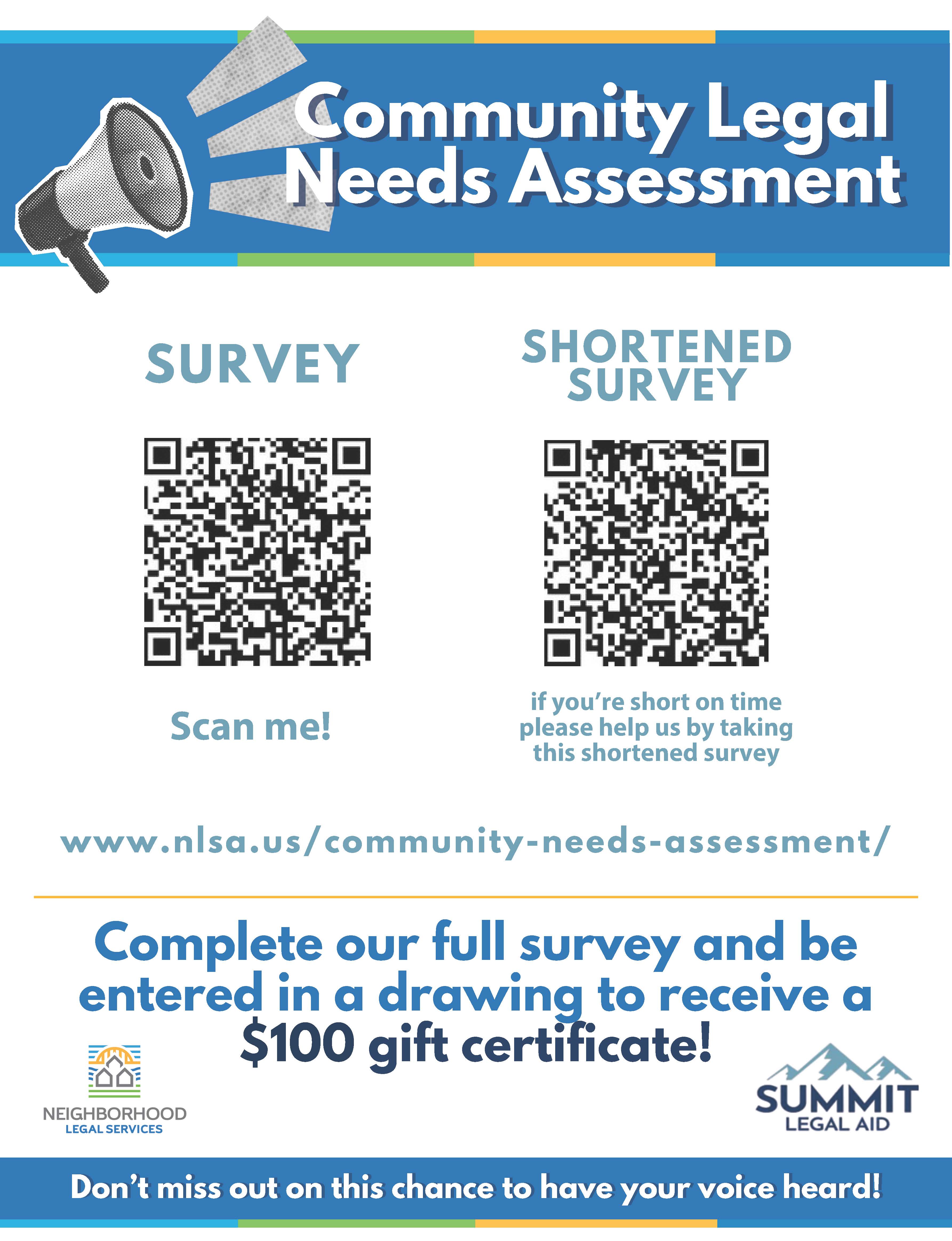 Neighborhood Legal Services and Summit Legal Aid want to hear from you—even if you didn’t get services. Please take a few minutes to complete this anonymous survey to help improve legal aid for our community: