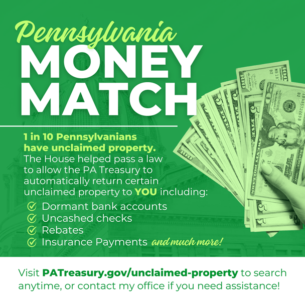 Once you receive it, you can start counting, because you will next get a check – within about 45 days. One in 10 Pennsylvanians has unclaimed property – if you didn’t get a letter, you can still check to see if there’s something for you! Call my office at (610) 266-1273 for more information.