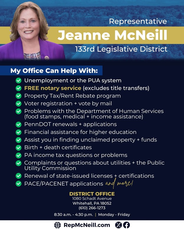 I want to share with you some valuable information on state programs and services and exciting updates from around the district. My staff and I are available to assist you with your concerns and access to state-related programs and services at my Whitehall office, located at 1080 Schadt Ave., so please stop by or call 610-266-1273.