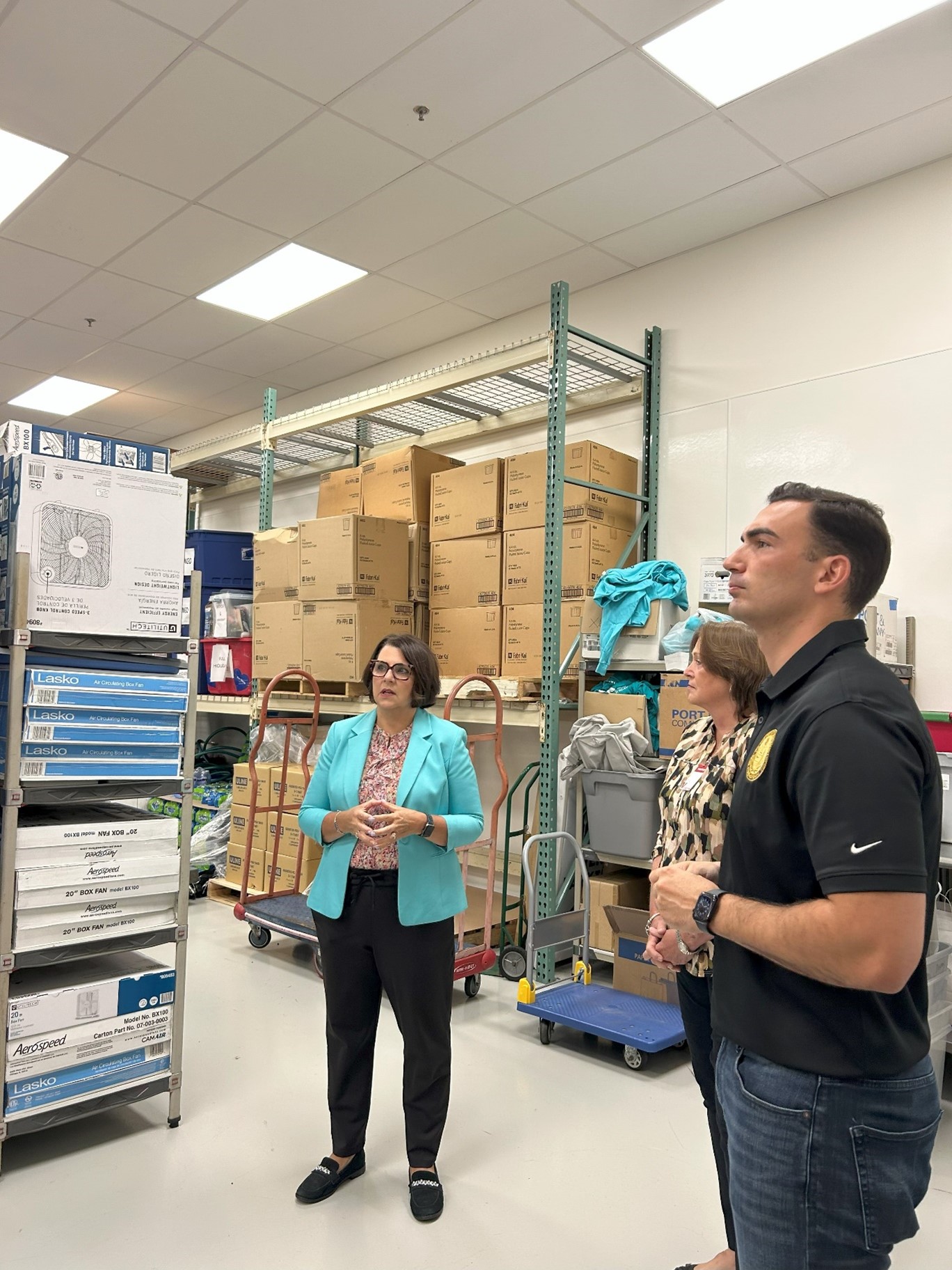 In the Meals on Wheels warehouse with Dina Kovats-Bernat and Senator Miller. Did you know that Meals on Wheels clients may be eligible to receive free fans and heaters? Some approved clients may also receive free pet food and cat litter for their pets.