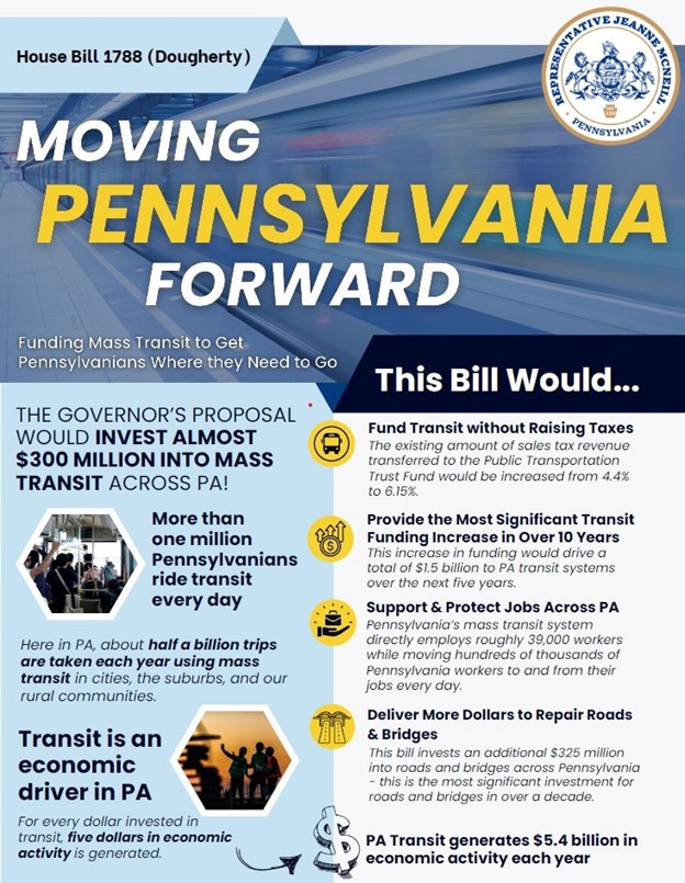 I recently voted to fund mass transit to get Pennsylvanians where they need to go. Above is a great graphic with information about this bill and how it will help those living here in the commonwealth.