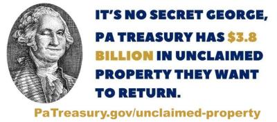 The PA Treasury is holding billions of dollars in unclaimed property and some of it could be yours. Unclaimed property is any financial asset that has been left with a bank, insurance company, business or organization without any activity for five years. Contact my office today or visit patreasury.gov to see if there is unclaimed property waiting for you.