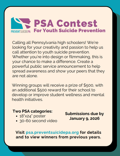 The Office of Mental Health and Substance Abuse Services, in partnership with Prevent Suicide PA, is hosting a contest for high school students to create public service announcements raising awareness about suicide prevention. Groups can submit either an 18" x 24" poster or a 30–60 second video. Winning groups will receive $500, with an additional $500 awarded to their school to support student wellness and mental health initiatives. Visit this page to learn more.