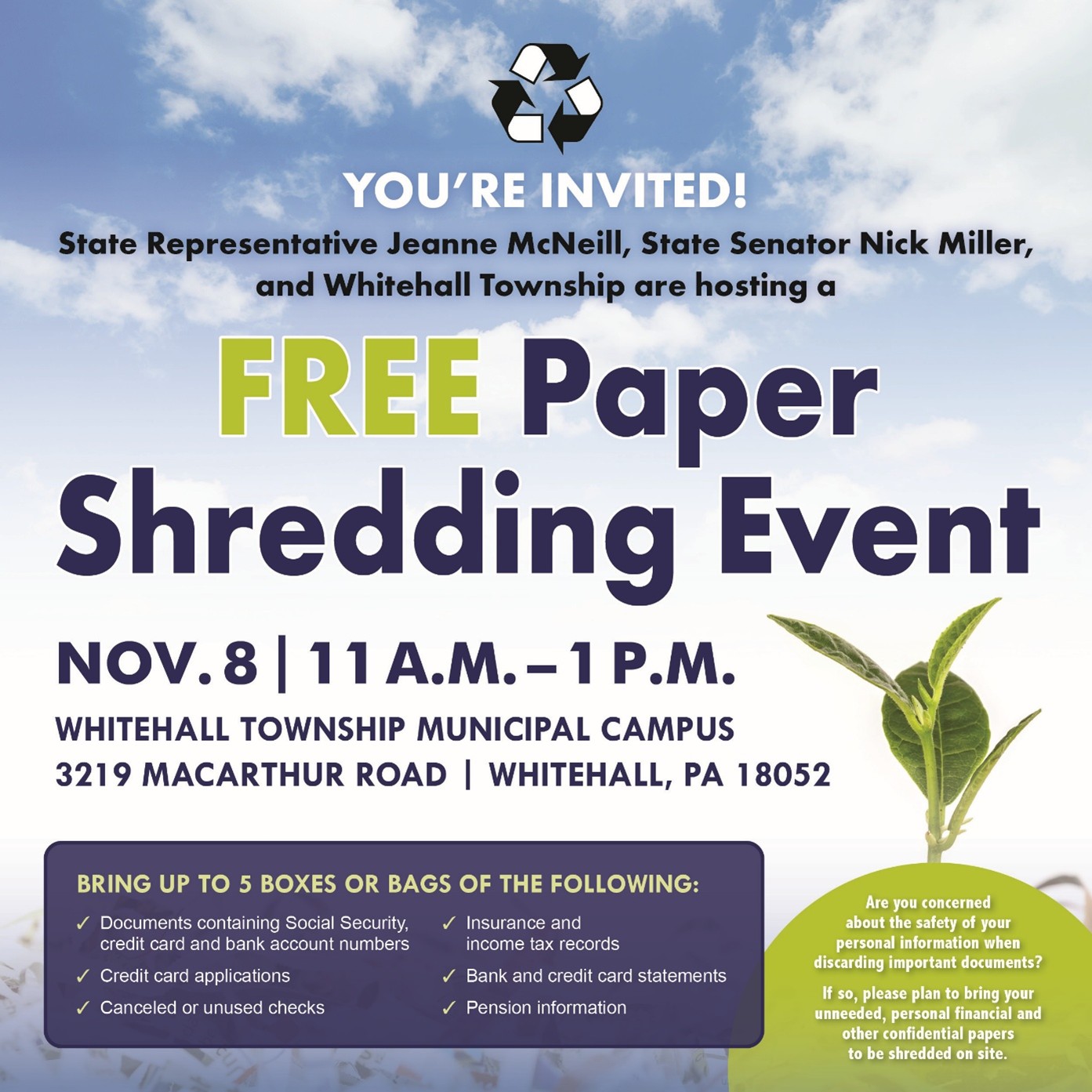 The shredding event will take place on November 8, from 11 a.m. to 1 p.m., at the Whitehall Township Municipal Campus, located at 3219 MacArthur Road, Whitehall, PA. If you have any questions, please don’t hesitate to reach out to my office.
