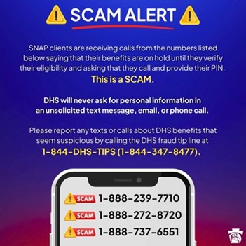 It’s a SCAM. DHS will never ask for personal information in an unsolicited text message, email, or phone call. Please report any texts or calls about DHS benefits that seem suspicious by calling the DHS fraud tip line at 1-844-DHS-TIPS (1-844-347-8477).