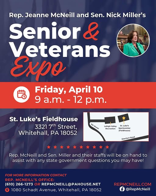 I want to share with you some valuable information on state programs and services and exciting updates from around the district. My staff and I are available to assist you with your concerns and access to state-related programs and services at my Whitehall office, located at 1080 Schadt Ave., so please stop by or call 610-266-1273.