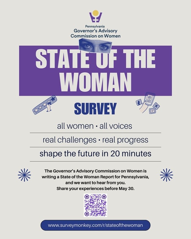 The Governor’s Advisory Commission on Women is gathering input from women across PA via a new digital survey as part of the Shapiro Administration's forthcoming State of the Woman Report, a comprehensive, data-driven effort to assess the status of women across Pennsylvania. The survey will collect insight from PA women on their experiences and priorities to better inform the Administration’s policies that impact women.