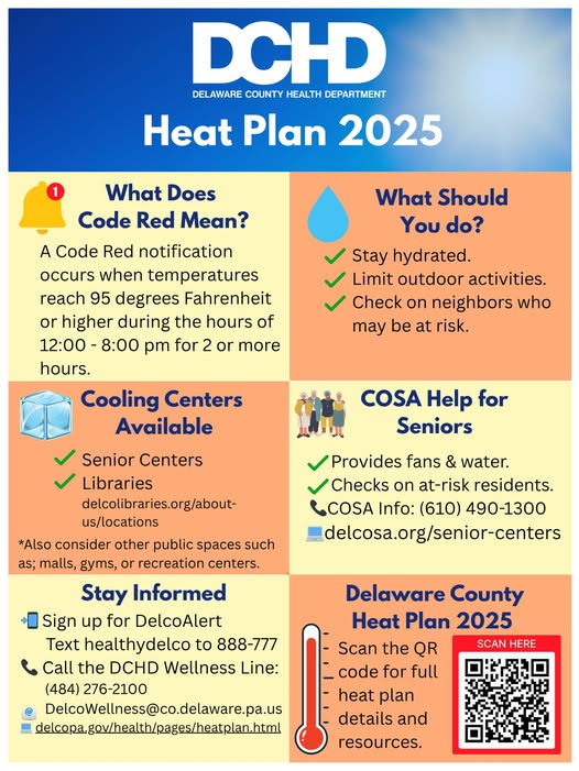 To help everyone stay safe when temperatures rise, I want to make sure you’re aware that Delaware County has a new and improved Extreme Heat Plan. It includes Code Red alerts and cooling centers at senior centers, libraries, and community buildings.