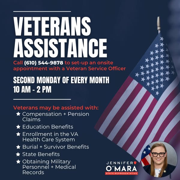If you know a veteran who needs help with their benefits, we have help available. A Veteran Service Officer (VSO) is available at my office by appointment on the second Monday of every month from 10 am to 2 pm. Spots are limited. Call 610-544-9878 to schedule an appointment.