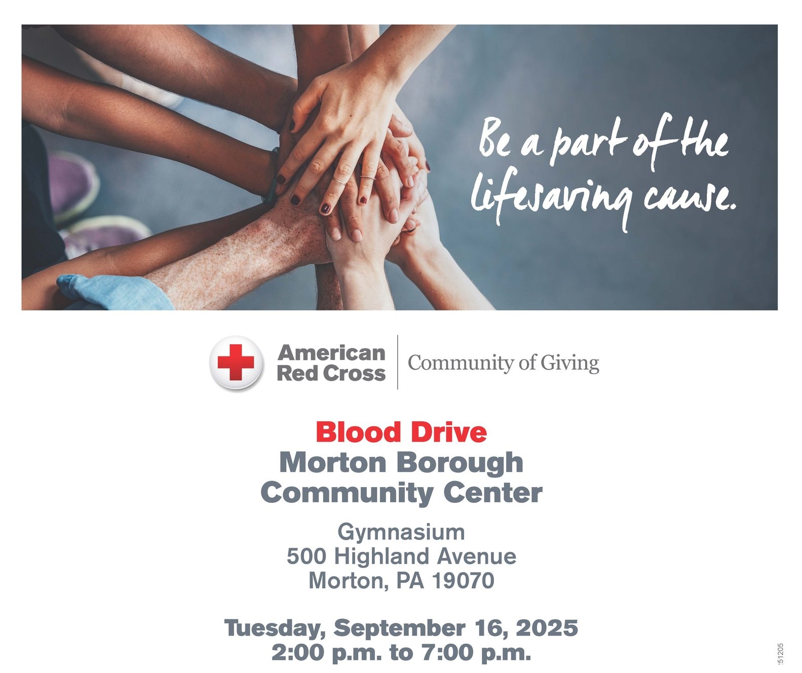 The American Red Cross says its need for blood donors is critical, so please consider giving blood when the Red Cross hosts a blood drive at Morton Borough Community Center on Sept. 16. To schedule an appointment, call 1-800-733-2767 or visit www.redcrossblood.org and enter Morton Borough.
