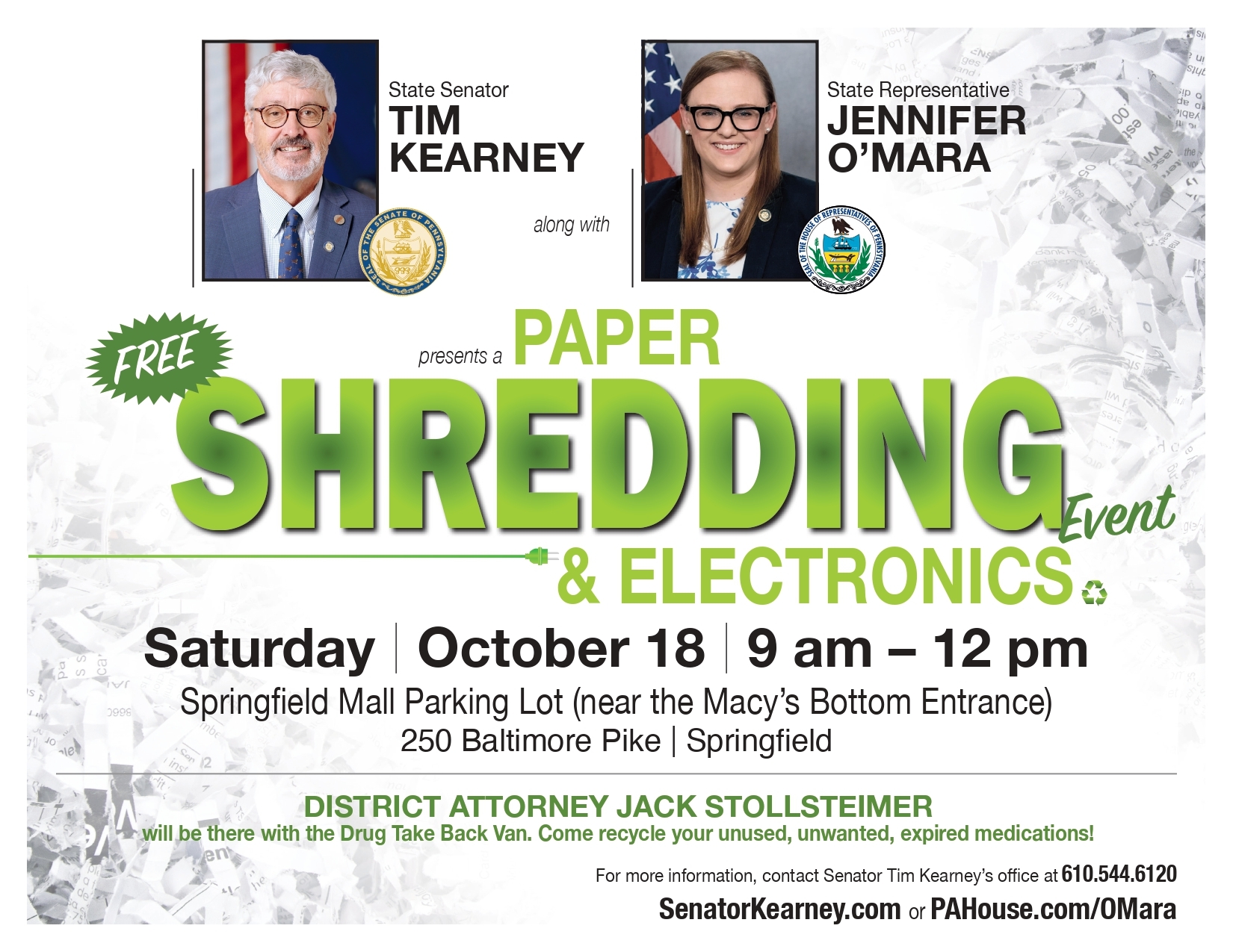 Don’t forget – my shred event with Senator Kearney is this Saturday, October 18 from 9 am to 12 pm. Stop by the Springfield Mall parking lot, back by the Macy’s, to have up to four boxes of personal documents shredded, electronics without freon or loose batteries securely recycled, or old and unused medications safely disposed of.