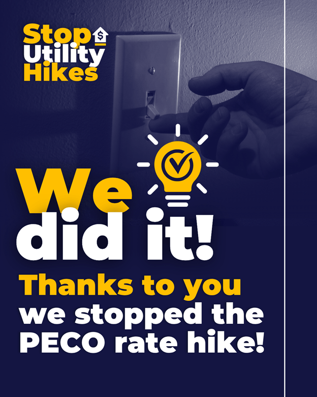 We did it! Our pressure campaign, our letters, and our petition against PECO’s proposed rate hikes worked! Gov. Shapiro yesterday announced that PECO has withdrawn their rate hike request with the PUC.