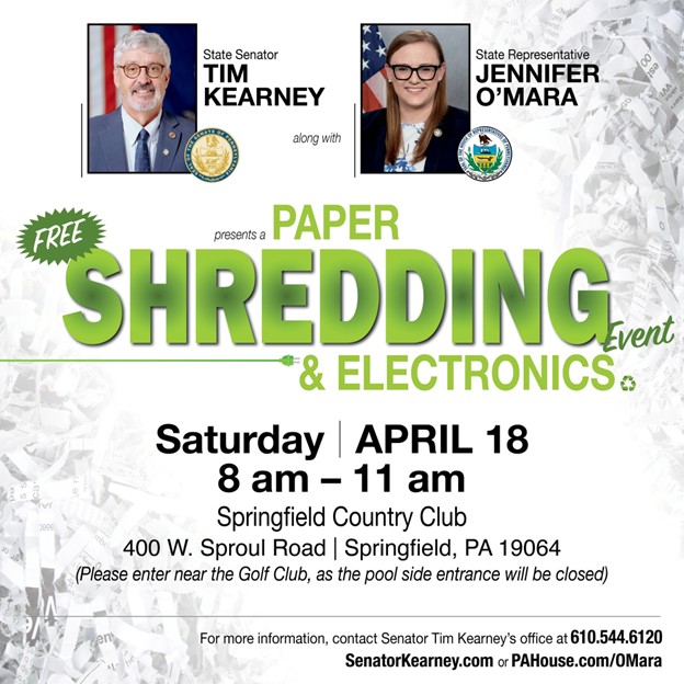 Tomorrow is my annual Paper Shredding and Electronics Event with Senator Tim Kearney! Between 8 a.m. and 11 a.m., stop by the parking lot at the Springfield Country Club to have your personal documents securely shredded on site or electronics safely and securely disposed of. Please note: