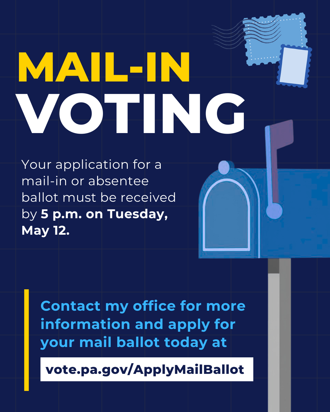 Just visit votespa.com to request your ballot. Once you receive it, fill it out and mail it or drop it in a drop box, or submit it at your county election office. That's it! If you don’t put your ballot in the mail by May 12, then you should drop it off – don’t risk your vote not being counted. Your mail-in ballot must be RECEIVED by 8 p.m. on May 19.