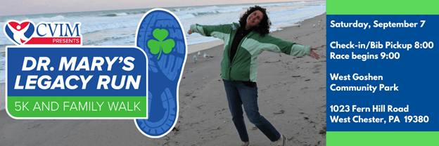 Community Volunteers in Medicine (CVIM) is hosting its 2nd Annual Dr. Mary's Legacy Run on Saturday, September 6, at 9:00 AM at West Goshen Community Park.
