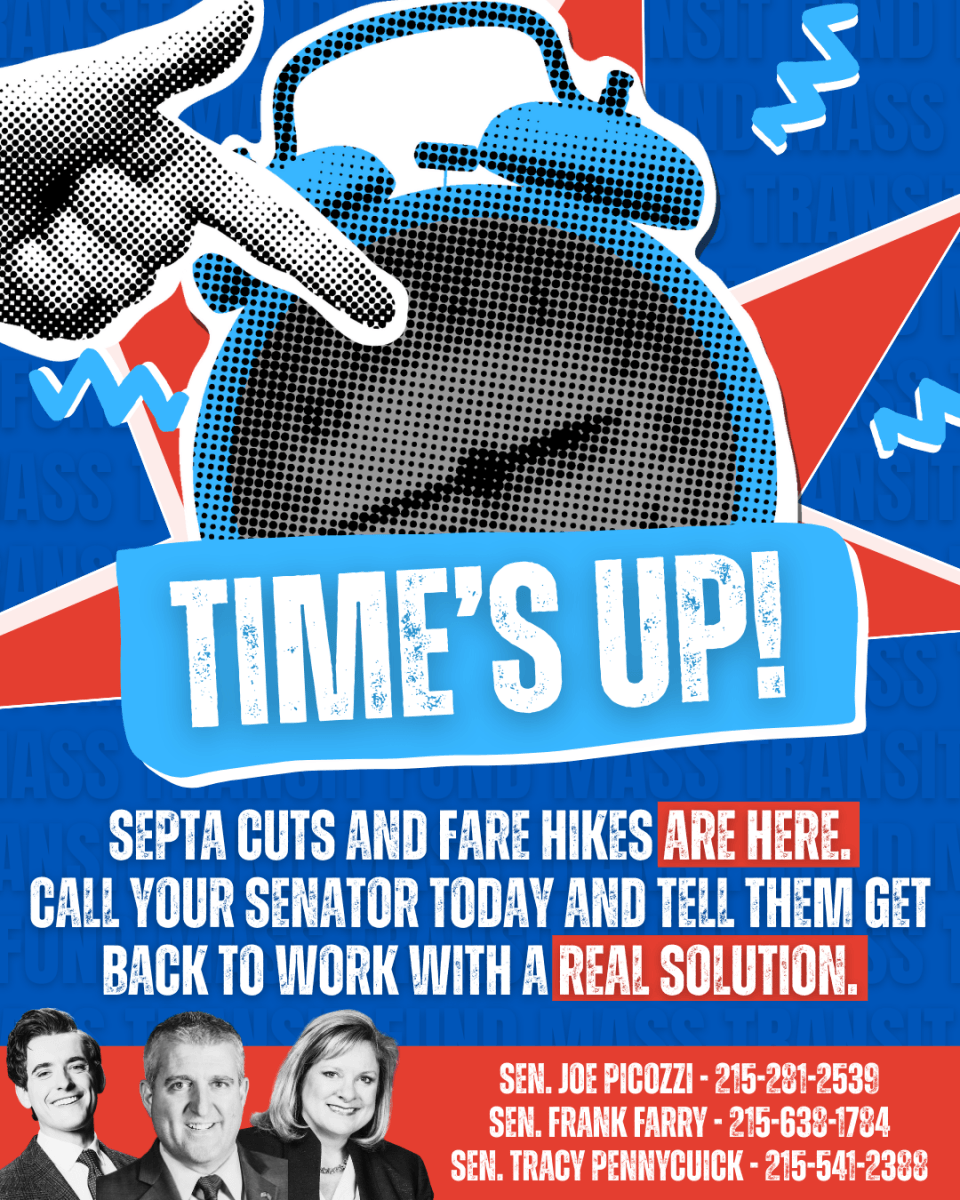 Time's Up! The crisis is here. This is about real people and real jobs in Southeast PA and across the Commonwealth. Everyone's morning commute will get worse, kids won't get to school, seniors will be trapped at home and unable to make their medical appointments, and honest, hard-working residents who don’t own cars won’t be able to get to work.