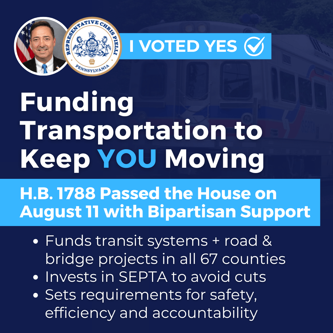 On August 11, my PA House colleagues and I passed House Bill 1788, which would have invested almost $300 million into mass transit - the most significant transit funding increase in over 10 years - without raising any taxes.