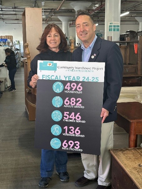 Last week, I had the honor of meeting with the Community Warehouse Project of Chester County staff during a tour of their warehouse. I was amazed by the quality of the furniture collected and the volunteer force that runs this organization. Through conversations with Glenda Brion, I learned how many people are provided for with the utmost care and consideration from their dedicated staff. That is why I have the pleasure of naming the Community Warehouse Project of Chester County this month’s Hometown Hero organization!