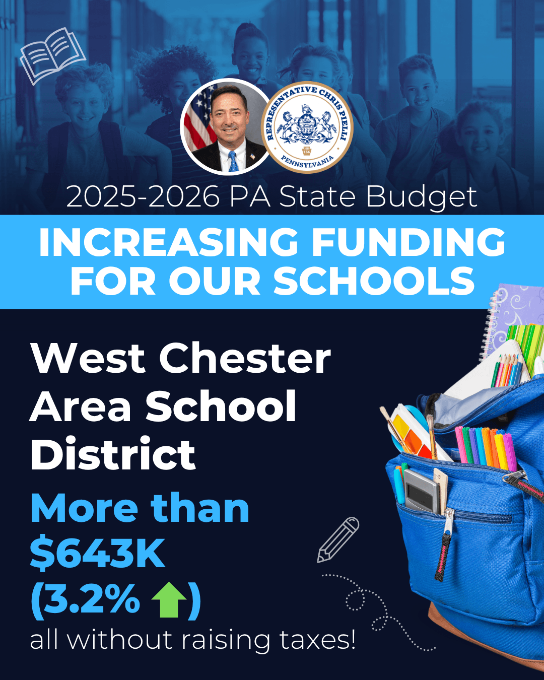 For West Chester Area School District, the state budget allocates a $643,000 (or 3.2%) increase in state funding. ALL without raising your state taxes.