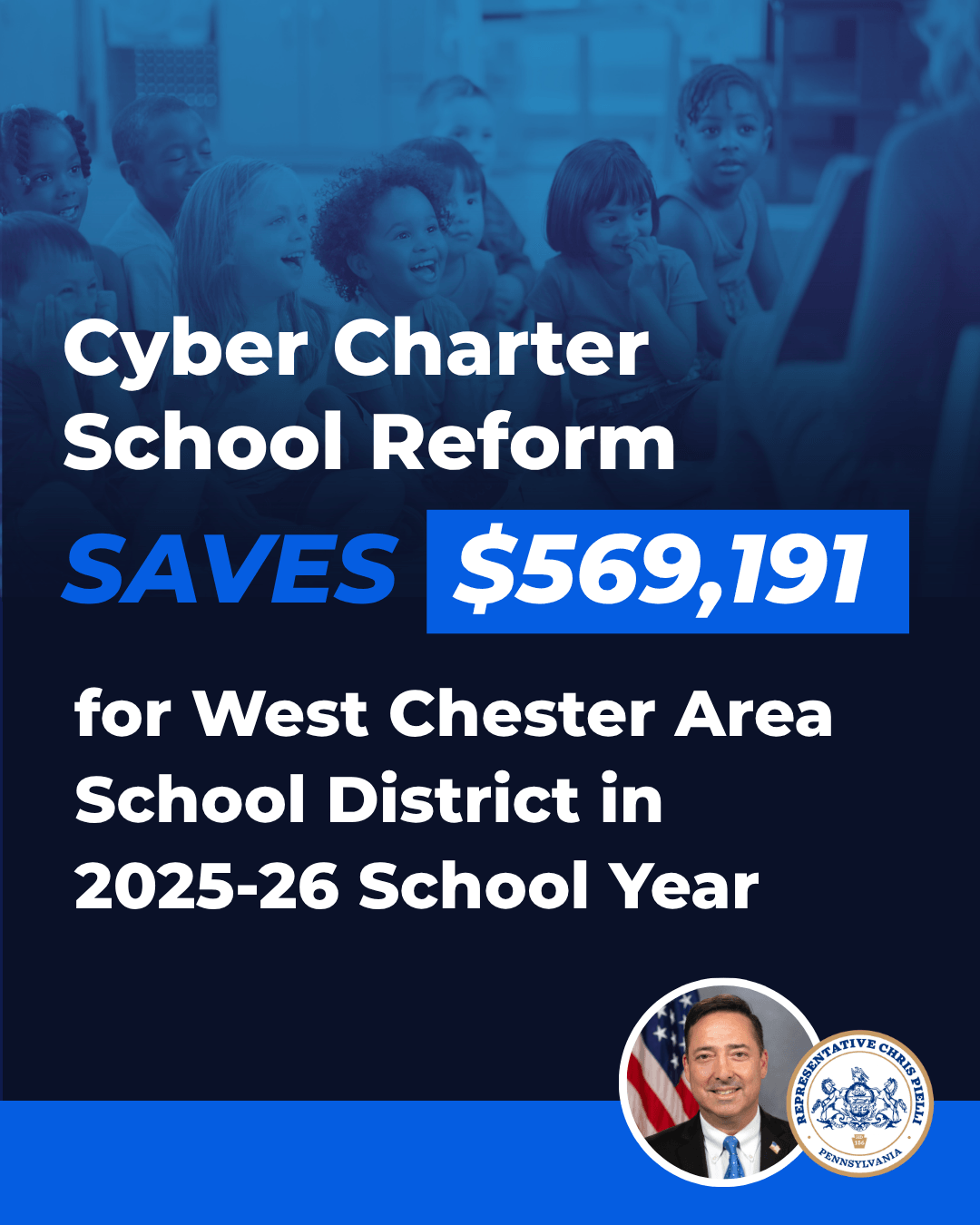 - We developed a fair funding formula for cyber charter schools helping to address overpayments and profits at the expense of real brick and mortar, tax payer funded, public schools. This will save PA taxpayers $178 million dollars and our local West Chester Area School District taxpayers $569,191.