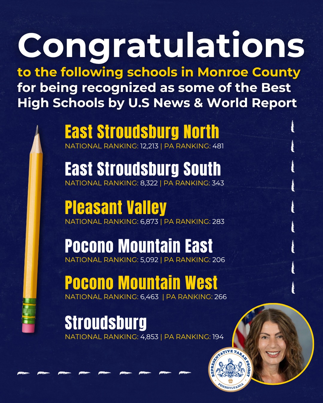 We are proud to share that Monroe County high schools have been recognized as some of the top-ranking schools in Pennsylvania and across the United States. This achievement is a testament to the dedication of our students, teachers, staff, and families who work tirelessly to make our schools places of excellence and opportunity. From the classroom to the community, your hard work and commitment shine brightly and make Monroe County a place we can all be proud to call home.