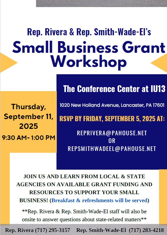 Join Rep. Izzy and me for our Small Business Grant Workshop on Thursday, September 11th, from 9:30 AM – 1:00 PM at the Conference Center at IU13!