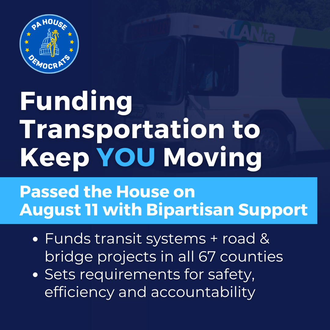I’m proud to report I voted to fund transit in every county, improve accountability, and invest hundreds of millions of new funding into fixing roads and bridges all over the commonwealth. The House voted 108-95 on August 11 to fully fund transit - for the fifth time - and sent the legislation to the state Senate.