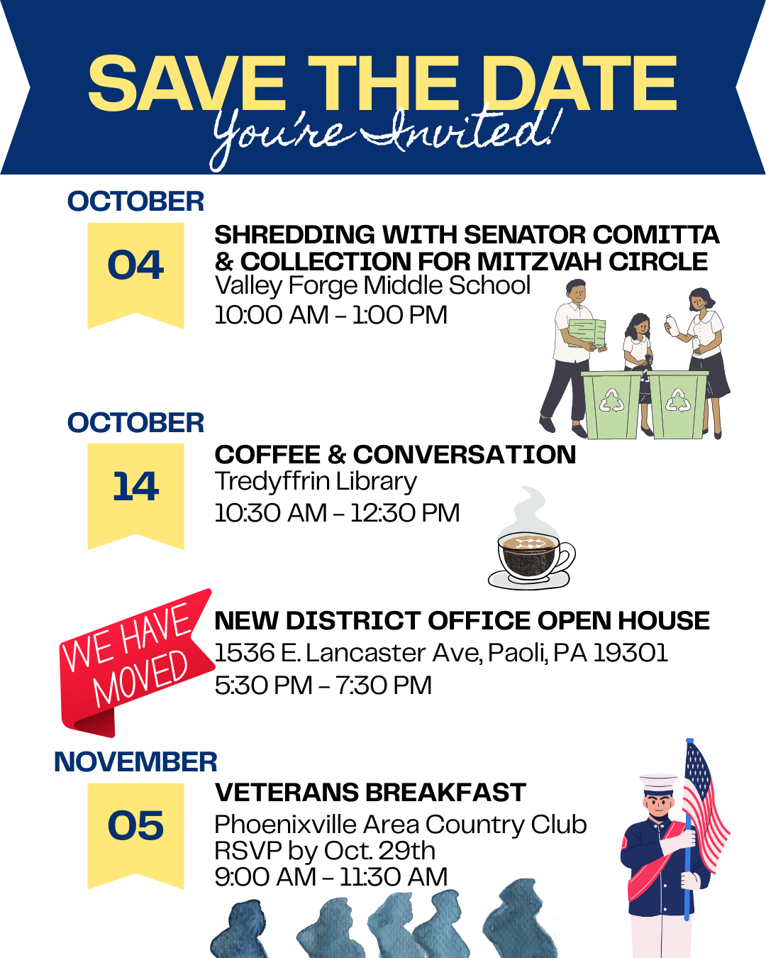 Come meet and chat with me about the issues that matter to you. I am holding a morning Coffee & Conversation on Tuesday, October 14th at Tredyffrin Library. If you cannot make it in the morning, join me in the evening at our District Office. Come see our new space and let us help you with state services.