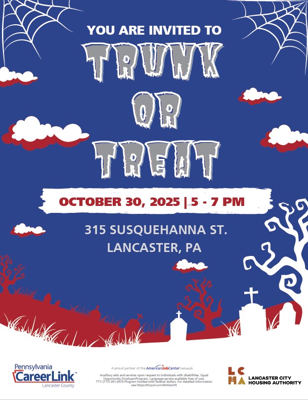 PACL Lancaster County will sponsor and host a Trunk or Treat event for the community on Thursday, October 30, from 5:00 PM to 7:00 PM at the Lancaster Housing Authority on Susquehanna Street.