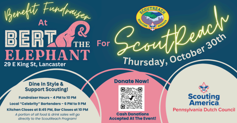 I’ll be guest bartending from 6:45 p.m. to 7:30 p.m. on Thursday, October 30, at Bert and the Elephant to support the ScoutReach program. ScoutReach is dedicated to ensuring that all youth have the opportunity to join Scouting—regardless of their circumstances, neighborhood, or background. Hope to see you there!