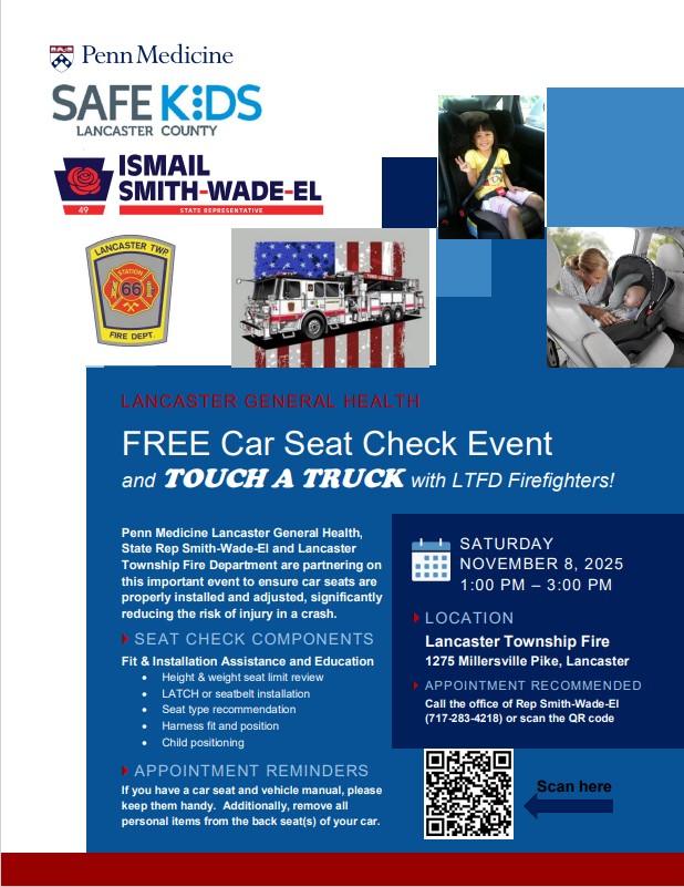 I will co-host, along with Penn Medicine Lancaster General Health and Safe Kids Lancaster, a free Car Seat Check and Touch-a-Truck event featuring Lancaster Fire Department firefighters from 1:00 p.m. to 3:00 p.m. on Saturday, November 8, at Lancaster Township Fire, 1275 Millersville Pike, Lancaster.