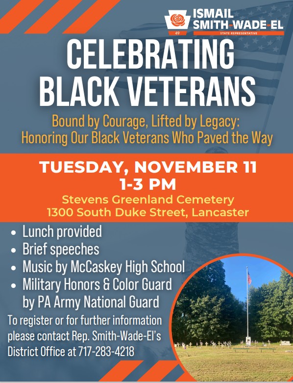 As a proud Black Lancastrian, I am honored to lead a Veterans Day event recognizing our city’s often-overlooked Black veterans—men and women who fought to protect American freedom and uphold our nation’s ideals around the world, even while facing discrimination both in service and at home. This event will offer an opportunity to give our Black veterans the honor and recognition they deserve as true heroes of our great republic.
