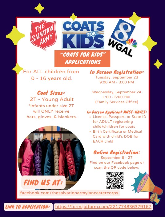 The Salvation Army, in partnership with WGAL, will be hosting its "Coats for Kids" program. For registration and more information, please visit their Facebook page or scan the QR code on the flyer.
