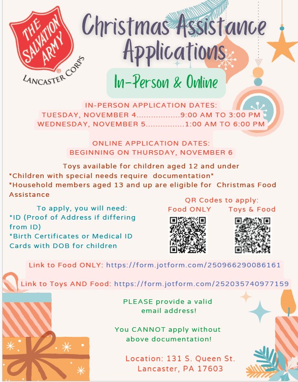 The Salvation Army will begin accepting in-person and online applications for their Christmas Assistance program starting in November. For any questions about the program, please contact the Salvation Army directly at (717) 397-7565.