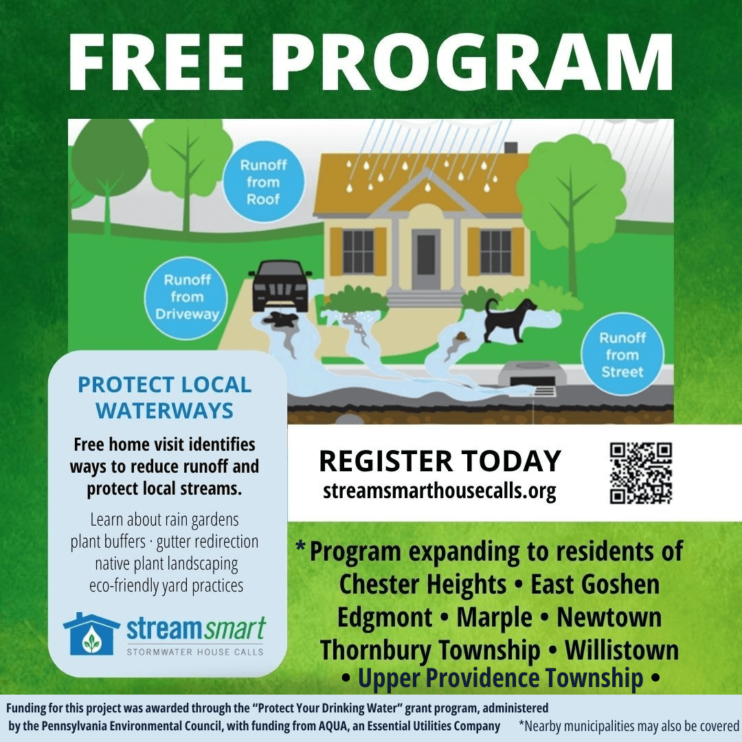 Residents of the upstream areas of the Chester, Ridley and Crum Creek Watersheds can register for a free Stream Smart House Call to identify ways to reduce runoff and protect local streams.