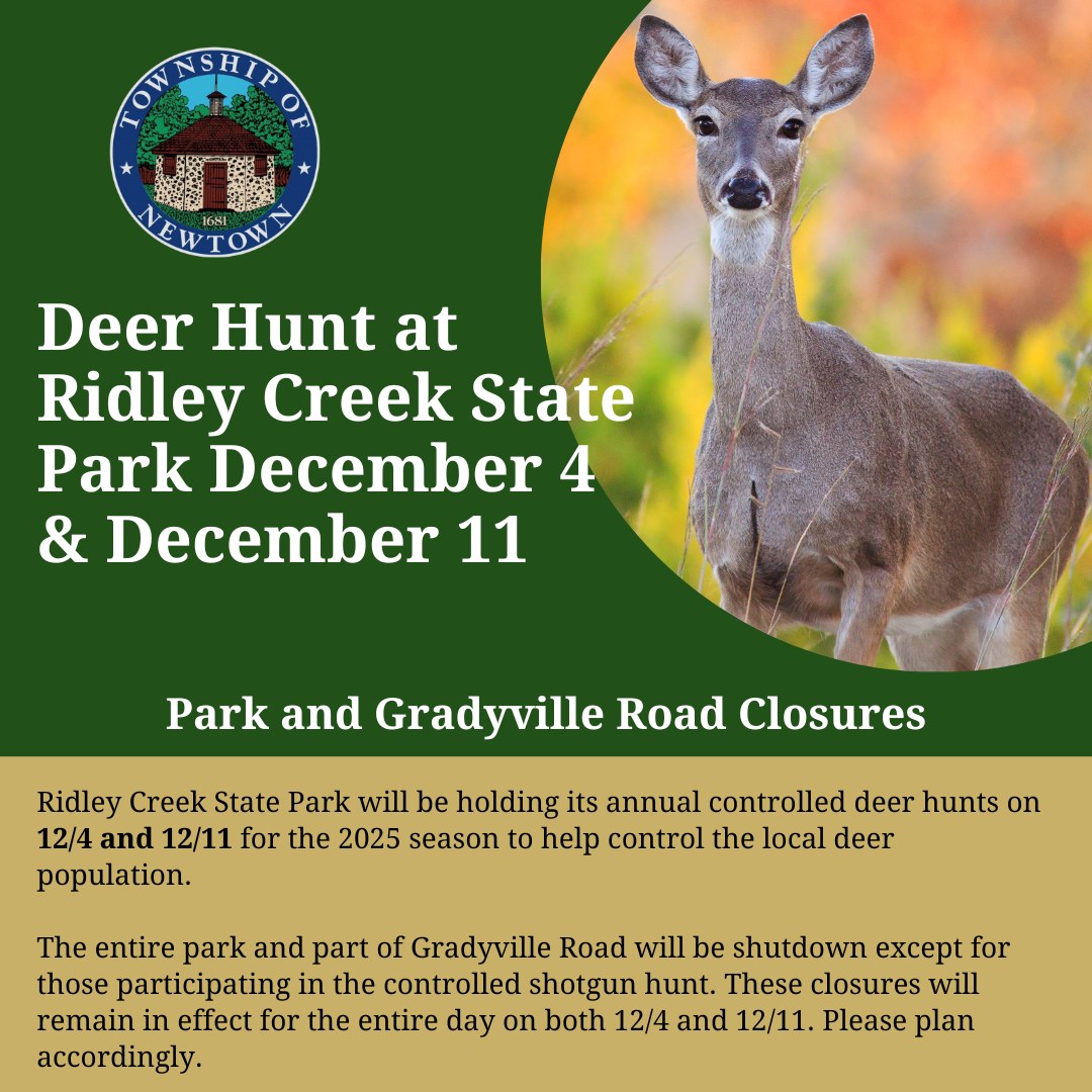 - Deer hunt at Ridley Creek State Park (Dec. 4 & 11)