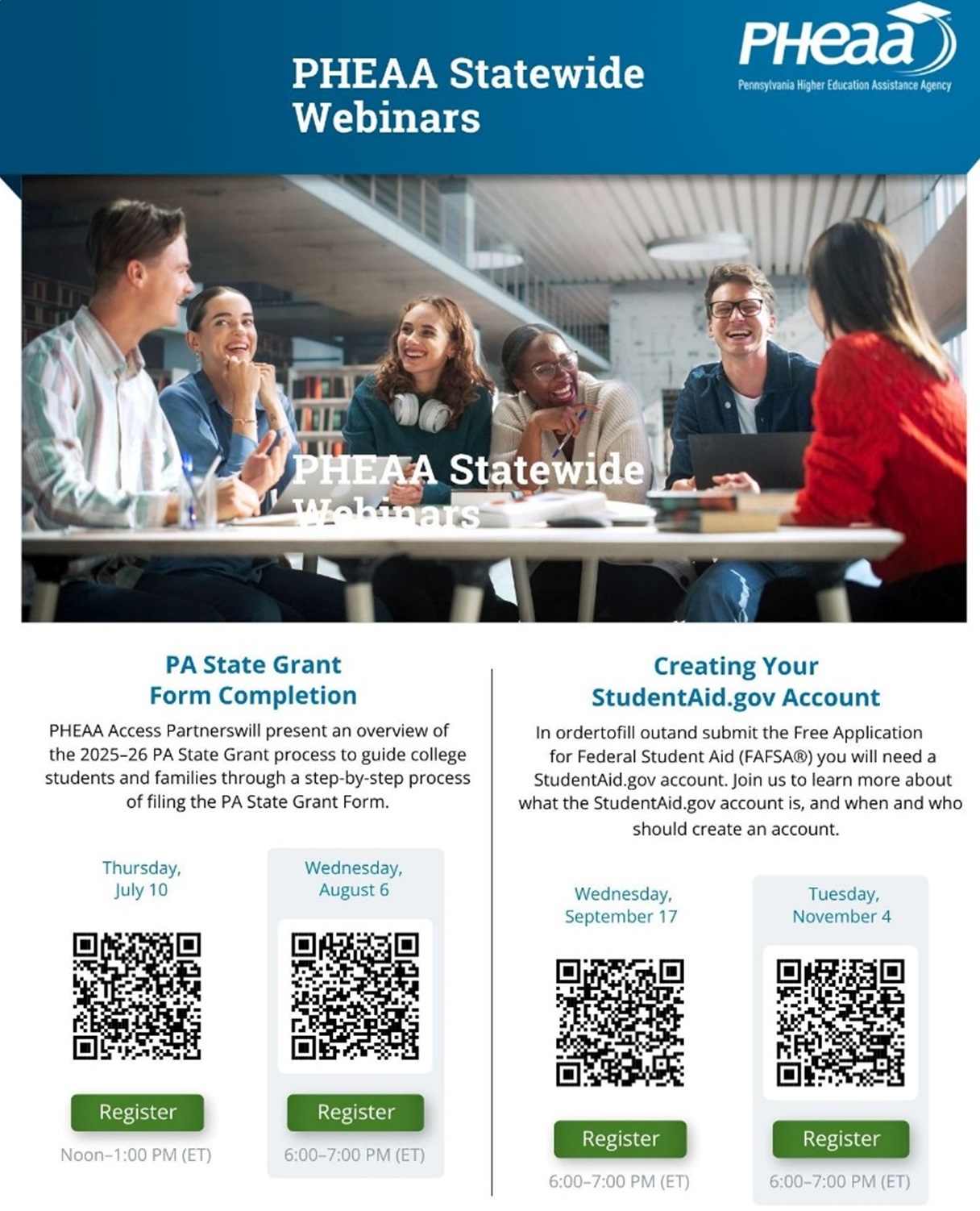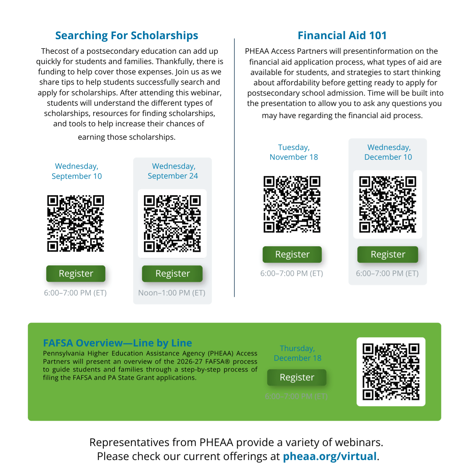 The Pennsylvania Higher Education Assistance Agency (PHEAA) is offering webinars throughout the end of the year to assist families with student aid and financial assistance.