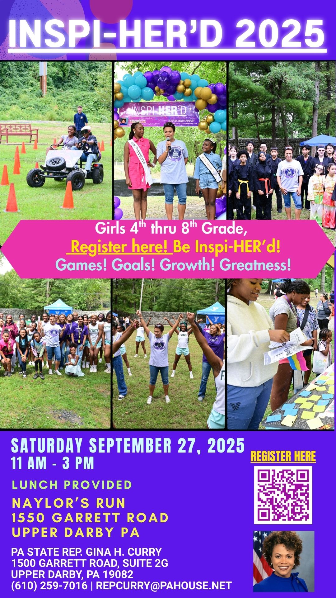 My colleague, Rep. Gina H. Curry, is hosting Inspi-HER’d on September 27. Girls in fourth through eighth grade are welcome to participate in this field day at Naylor’s Run Park in Upper Darby. The event will focus on bringing girls in the community together with leaders, advocates, and organizations who have their best interests at heart.