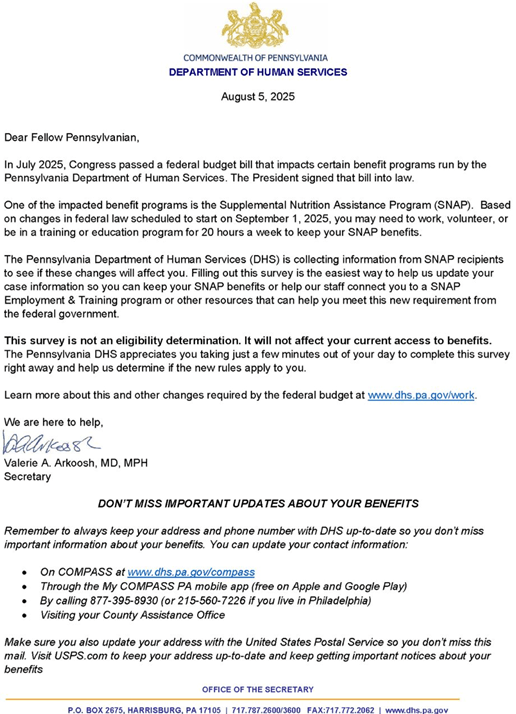 To guide you through these changes, the Shapiro Administration has created a one-stop resource at dhs.pa.gov/work. You’ll find who must comply, how to submit your hours, and information on possible exemptions.